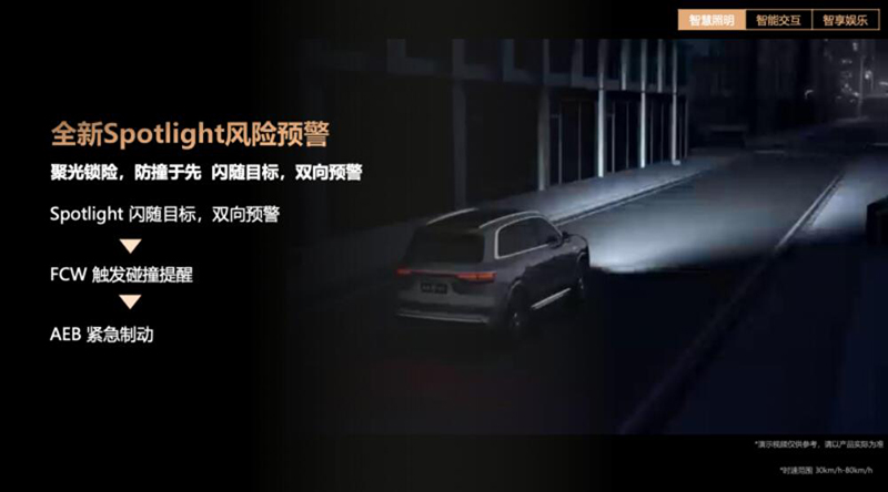智能交互:让车灯会“说话”,实现车与万物无声沟通 当基础照明得到有效保障后,HUAWEI XPIXEL智能车灯模组还将智能车灯的价值延伸至交互场景。赖岚将这一演进描述为“让车灯会说话”。 比如,当系统检测到有行人或非机动车突然闯入,存在碰撞风险时,“全新Spotlight风险预警”功能会与华为乾崑智驾ADS联动,用一束高亮光精准锁定目标并快速闪烁,实现车对人的“双向预警”,将被动警示升级为主动安全干预,有效保障驾驶员与行人的安全。