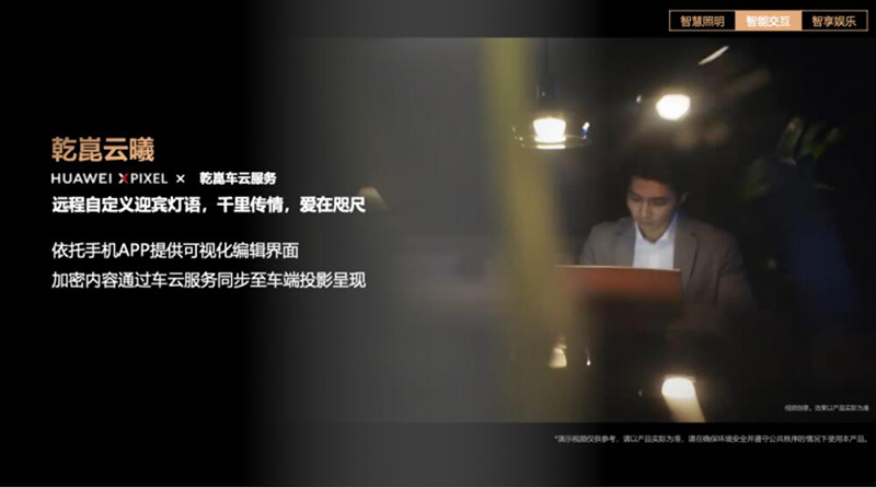 为了打造全场景的尊贵体验,HUAWEI XPIXEL智能车灯模组还推出了超近场迎宾与快启互动迎宾功能。当用户靠近车辆时,车灯便会投射出专属的光效或欢迎语,将科技的温度与仪式感融入每一个细节。此外,通过个性化的“乾崑云曦”功能,用户还可远程自定义迎宾灯语,让每一次启程都充满仪式感,为人与人的互动增添温情。