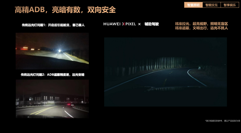 智慧照明:重构安全,让每一次出行都“亮暗有数” 安全是用户出行的基石。夜间行车时,驾驶员视野受限,如果再遇到对向来车开启远光灯,则更难以看清前方路况。针对这一驾驶者的共同困扰,HUAWEI XPIXEL智能车灯模组将华为乾崑智驾ADS的强大感知能力与高精ADB(自适应远光灯)技术相结合,让车灯拥有了“智慧”。简言之,当系统识别到对向车辆或行人时,可在毫秒间自动调整光线,既能为驾驶者保留完整的照明视野,又能精准遮蔽照射到其他车辆或行人的光线,同时还能屏蔽对向车辆的远光灯干扰,极大降低了夜间会车的事故率,让远光灯不再只是“照亮自己”的工具,而成为兼顾双向安全的可靠保障。