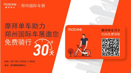 为缓解交通拥堵,减少环境污染,推动骑行文化,郑州国际车展联合摩拜共享单车开展绿色出行活动,为您免费解决最后1公里的出行接驳。 扫码或关注“郑州国际车展”微信公众号,即可免费领取摩拜单车月卡,0元骑车30天 ,绿色出行从现在开始! 领取条件: 摩拜账户没有正在使用免费月卡的用户关注郑州国际车展微信公众号后均可领取(不限新老用户)。 活动规则: 如果您是摩拜新用户,即刻领取免费月卡;如果您是摩拜老用户,再给您一次免费领取月卡的机会;免费骑行30天,根本停不下来。 如果您之前已经领取过免费月卡,在现有月卡时效结束后即可再次领取。