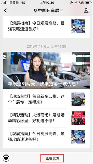 本届车展将每天发放499张免费车展门票,先到先得。小编还特别为大家整理了抢票攻略哦!赶紧和小编一起抢票吧! 免费抢票攻略: 1、进入“华中国际车展”官方微信,点击“免费索票”,填写并提交报名信息,以便客服联系您发送门票。