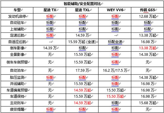 从上述对比可以看出,传祺GS5在安全配置上因价格的区别对待,使得低门槛的优势大打折扣,星途TX在安全上的配备都要远胜同价位的传祺GS5;至于星途TXL与VV6,两者可谓棋逢敌手。