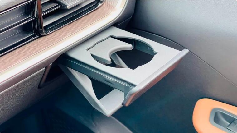 还有左右杯架,采用了隐藏式设计,平时不用就可以收回,节省空间并保持美观。需要的时候轻按即可弹出,而且杯架正好位于出风口下方,这样饮料冬天可加热,夏天可制冷,真是一举两得。