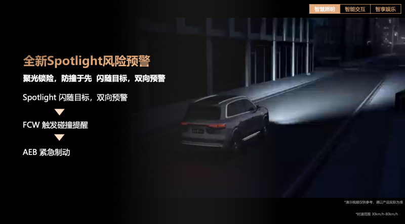 智能交互:让车灯会“说话”,实现车与万物无声沟通 当基础照明得到有效保障后,HUAWEI XPIXEL智能车灯模组还将智能车灯的价值延伸至交互场景。赖岚将这一演进描述为“让车灯会说话”。 比如,当系统检测到有行人或非机动车突然闯入,存在碰撞风险时,“全新Spotlight风险预警”功能会与华为乾崑智驾ADS联动,用一束高亮光精准锁定目标并快速闪烁,实现车对人的“双向预警”,将被动警示升级为主动安全干预,有效保障驾驶员与行人的安全。